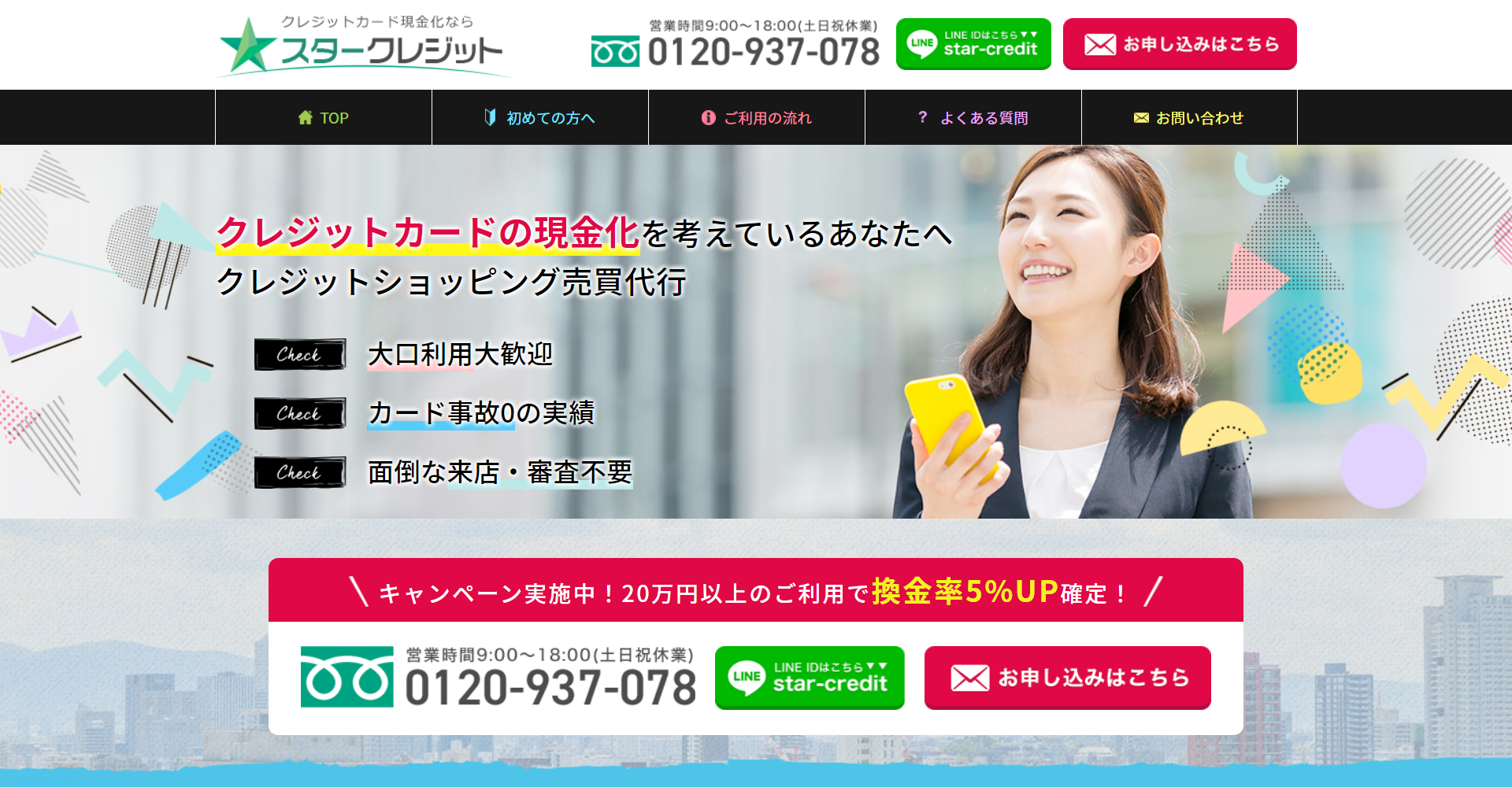スタークレジットは今までカード事故(カードの利用停止)やトラブルなどは全くなく、安全に現金化でき、換金率も良く振込みも速いなど利用者の評判が高い業者です。